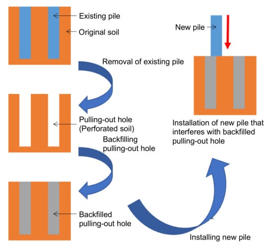 In urban areas, the number of cases where new structures are constructed at almost the same locations as the old structures has been increasing. Therefore, the position where the pile (existing pile) of an old structure was installed and the position where the new pile will be installed may overlap [,,,,,]. In such a case, the existing pile is pulled out, the pulling-out hole is backfilled, and then the new pile is constructed at that location. As the mechanical characteristics of the backfilling-treated pulling-out hole are different from those of the surrounding soil, problems such as inclination and eccentricity may be encountered during the construction of the new pile.