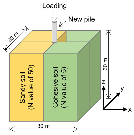 The study assumes a soil with one (homogeneous) mechanical property and a soil boundary with two (heterogeneous) mechanical properties. During the installation of the new pile on that soil, the behavior of the new pile is verified. Here, in the homogeneous soil, two cases are assumed: a homogeneous soil with an N value of 50 (Case-1) and a homogeneous soil with an N value of five (Case-2). Furthermore, it is assumed that soils with N values of 50 and five are halved in the heterogeneous soil (Case-3). Figure 6 corresponds to Case-3 and shows the position where a new pile is installed at the boundary between two types of soil with different mechanical properties. For Case-1 and Case-2, there is no boundary between the two types of soil, but the new pile is installed at the same position as that of Case-3. The load acting on the pile head of the new pile is 200 N/mm2.