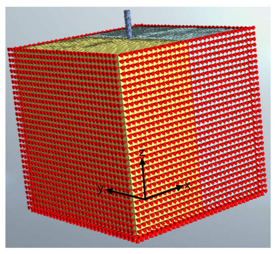 Figure 4 shows the analysis models applied in this study. A 30-m cube is used as the soil profile, and a cylinder that is one meter in diameter and 20 m in length is used to simulate the new piles. This cylinder (the new pile) that penetrates vertically into the cube (the soil) up to 15 m is the analysis model; it reproduces the situation where a new pile is installed on the perforated soil. The soil characteristics are changed by dividing the cube into two equal parts to represent the two types of soil with different mechanical characteristics after the removal of the existing piles, and a load is applied from the head of the cylinder. Table 1 shows the soil parameters, assuming sandy soil with an N value of 50, cohesive soil with an N value of five, and piles made of steel [,]. The elastic modulus, Poisson’s ratio, and wet volume mass were estimated from the N values. The boundary conditions, shown in Figure 5, restrict the displacement in the x-axis direction on the right, left, and bottom surfaces of the analysis model, and restrict the displacement in the y-axis direction on the front, rear, and bottom surfaces of the analysis model.