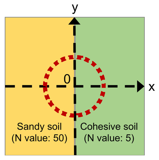Let us assume that there are two types of soil with different mechanical properties (equivalent to Case-3). As shown in Figure 6, there are two types of soil, one soil with an N value of 50 and another soil with an N value of five. The installing position of the new pile is 0 m, which is the boundary between the two types of soil, namely, the origin given in Figure 6 and the center of the new pile. The new pile can be moved only in the x-axis direction. For example, if the new pile is placed one meter away from the soil with an N value of 50, it will be expressed as −1 m. The load acting on the pile head of the new pile is 200 N/mm2.