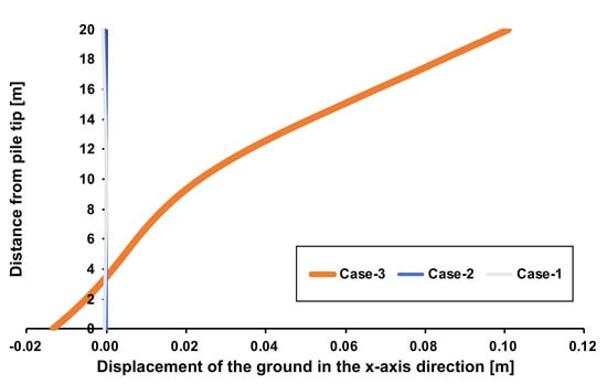 Comparison of displacements of ground in x-axis direction in Case-1, Case-2, and Case-3.