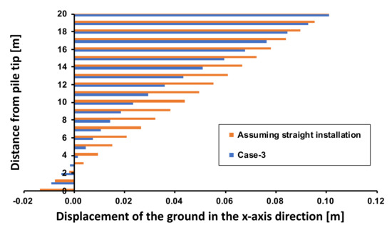 Displacements in x-axis direction as a result of Case-3, as well as when assuming that the new pile was installed straight, without deformation.