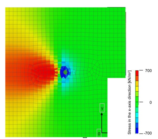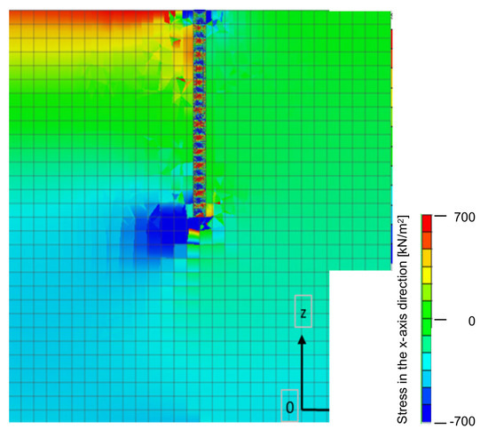 Figure 7 compares the displacements of the soil in the x-axis direction in Case-1, Case-2, and Case-3. The new pile cast in Case-3 tends to lean toward the soil with an N value of five (positive x-axis direction) compared to Case-1 and Case-2. Focusing on the deformed shape of the new pile, it can be confirmed that the warp rises to the soil side (negative direction in the x-axis direction) with an N value of 50, approximately 10 m from the tip of the pile. Figure 8 shows the displacements in the x-axis direction as a result of Case-3. It also shows, for reference, the assumption that the new pile was installed straight, without deformation. Figure 9 and Figure 10 show the stress in the x-axis direction inside the soil. Figure 9 is a top view of the analysis model, and Figure 10 is a cross-section of the analysis model cut parallel to the x-axis. Most of the new pile is inclined toward an N value of five, that is, the soft soil side. On the soil surface, the stress acts in the negative direction in the x-axis only on the soil around the pile, while the stress inside the soil with an N value of 50 is working on the positive direction in the x-axis.