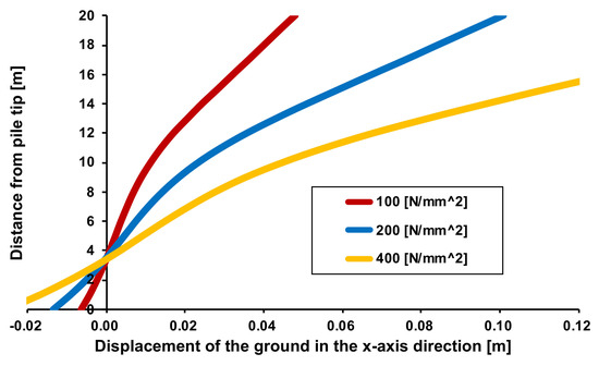 Comparison of displacements in x-axis direction when loads acting on pile head are 100, 200, and 400 N/mm2, respectively.