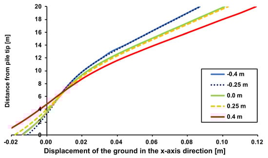 Figure 12 shows the displacements of a new pile when the new pile interferes with the two types of soil at the installing position. The specific displacements of the installing positions are ±0.25, ±0.4, and 0 m. Comparing the installing positions of these five new piles, it can be confirmed that the new pile whose installing position is shifted by +0.4 m is the most inclined.