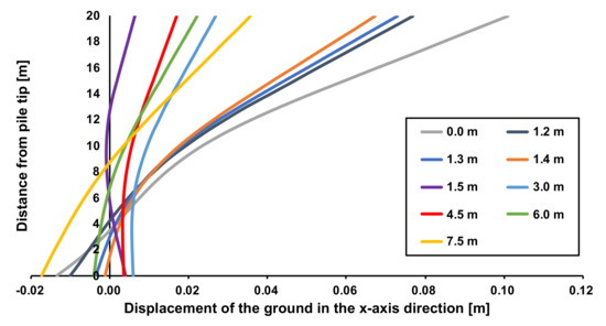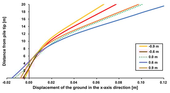 Figure 13 shows the displacements of the new pile when the installing position of the new pile is shifted by ±0.6 m and ±0.9 m. If the installing position of the new pile is shifted by 0.6 m, the new pile will interfere with either the soil with the N value of 50 or the soil with the N value of five. Comparing the installing positions of the five new piles, including the case where the installing position of the new pile is shifted by 0 m, the installing position that is shifted by +0.6 m is the position where the new pile is the most inclined. In addition, even when the installing position is shifted by the same 0.6 or 0.9 m, the displacements of the new pile are different between the soil that is shifted to the soil side with an N value of 50 and the soil that is shifted to the soil side with an N value of five.