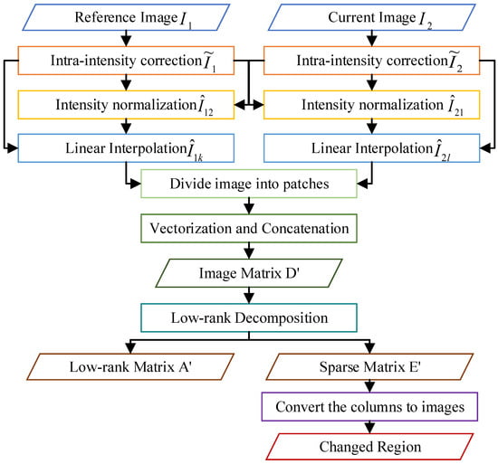 For two images, and , supposing the reference image is taken in the early stage, which can be regarded as the background image, then the current image is used to compare with the background to discriminate whether there was a change. Since is turned into and after taking the illumination correction and normalization [10], the low-rank background model is based on , so linear interpolation is performed between and . The formula is presented in (3):