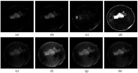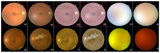 Figure 4g,h are the fundus image pair from Xinhua Hospital in Shanghai. The original image pair is of high resolution and is under-sampled to . Figure 4g is the reference image with a slight random spot on the low-right corner. Figure 4h is the current image involved with a big bright lesion. The image pair is also enhanced and corrected by IRHSF. Their corrected images are presented in Figure 4i,j separately, and their illumination models are shown in Figure 4k,l, respectively.