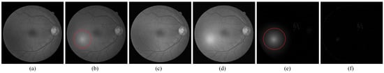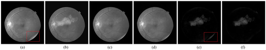 Figure 4a,b are the fundus image pair from the public dataset DRIVE [25]. Figure 4a is the original image taken as the reference image of the image pair, and Figure 4b is one attached with the red noise patch regarded as small lesions on Figure 4a, which is seen as the current image. Figure 4c,d are the images corrected by IRHSF and illumination models are presented in Figure 4e,f separately.