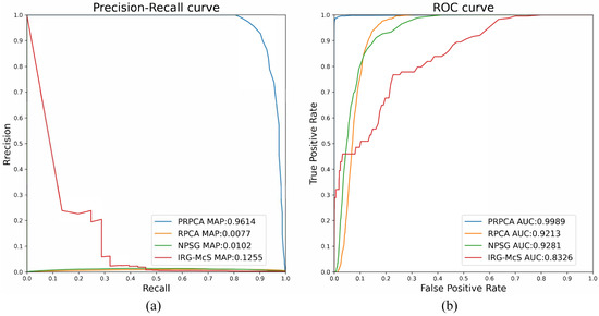 For the image pair with small lesions, four change detection techniques are used to prove the performance of the proposed methods, as illustrated in Figure 8: RPCA, IRG-McS [33], NPSG [34], and P-RPCA. The RPCA method performs poorly in the face of local flare and the result is significantly distracted, whilst the AUC and mAP are and , respectively, which is far lower than and for P-RPCA. In Figure 8, both the ROC and PR of P-RPCA are over the curves of the other three methods, which means that P-RPCA is significantly better than the other methods.