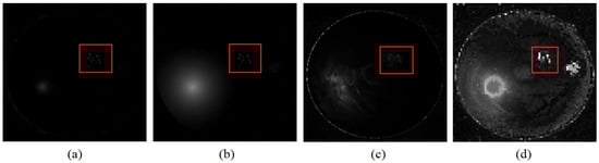 The image pair with a big lesion has a resolution of . In Figure 6, (a) and (b) are the normalized reference image and the current image, respectively, after registration, and (c) and (d) are the reconstructed background image by RPCA and P-RPCA, respectively. Figure 6e is the result obtained by the image matrix and low-rank decomposition after linear interpolation. The image pair from Figure 4g,h is corrected by IRHSF and normalized to each other, and then it is expanded to a sequence. For the reference image, the number of interpolated frames is 20 in order to obtain a stable background, and for the current image, the number of interpolated frames is 3. The image sequence after interpolation includes 23 frames and each image frame has a size of . The concatenated image matrix D has a size of . It can be seen that the features of the isolated large lesions are obvious, but the light spot in the reference image significantly distracts the change region as the red circle marks.
