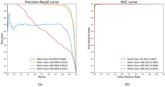 Influence of patch size on AUC and mAP values in the P-RPCA method. (a) PR curve, (b) ROC curve.