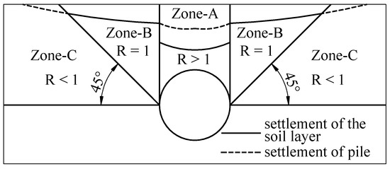 According to an analysis of the line selection of the English Channel and the relationship between the settlement of the pile and the settlement of the surface, Selemeta [4] partitioned the surrounding rocks of the tunnel as shown in Figure 1, with R as the ratio of pile settlement to surface subsidence. The settlement of the layer is larger than that of the pile in zone A, and zone B is close to it, while zone C shows that the settlement of the pile is less than the soil settlement.