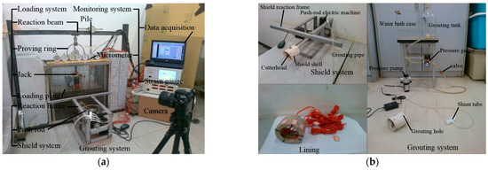 A plane strain shield tunneling model test system was designed to realize automatic pushing and tail grouting. It is mainly composed of four parts: the test platform, the shield grouting module, the loading module and the monitoring module (Figure 2).