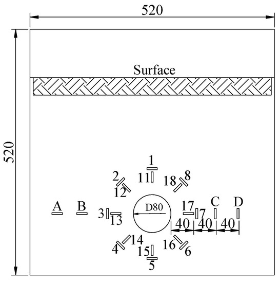 The layout of pressure-cell (mm). Note: Radial pressure monitoring 1~8, C, D; Circumferential pressure monitoring 11~18, A, B.