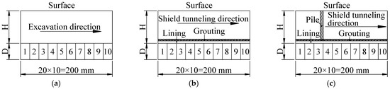 Excavation process: First, the shield pushing controller was started, then turned to full section jacking with a speed 1 mm/s, with the footage of 2 cm per ring, and digging shovel was used to clean out of the ejected soil in time. At the same time, the pressure pump was started to grout the liquid slurry evenly according to the grouting volume. After each ring of excavation and support was completed, it was allowed to stand for more than 20 min, so that the slurry solidified and the surrounding rock was fully deformed. After the reading of the monitor was stable, the next cycle of excavation was carried out, and the macro response of the surrounding rock and pile around the tunnel was dynamically recorded in real time. The whole process of video recording was convenient for later PIV software processing and observation of the displacement field.