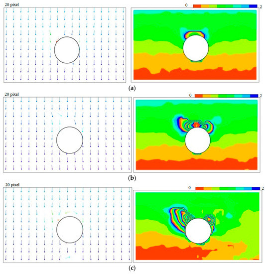 PIV vector diagram and contour of displacement: (a) Transient arch forming stage; (b) Large deformation-fracture stage; (c) Roof block falling stage.