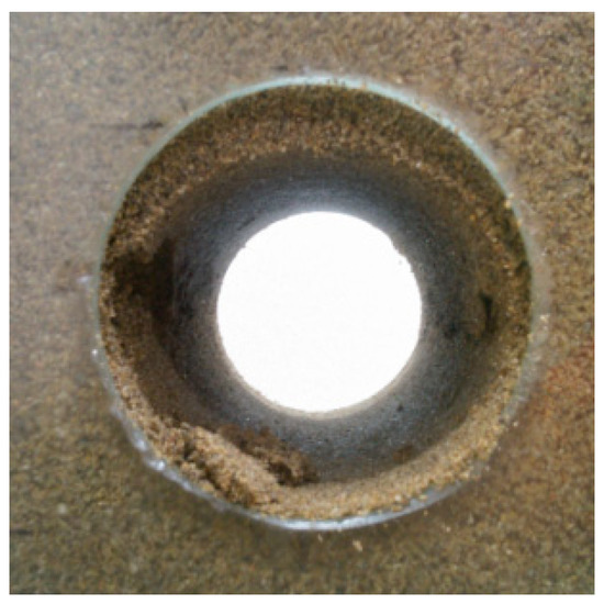 When the grouting filling coefficient was 2.0, surface slurry leakage occurred; the process is shown in Figure 15. At first, the grout around the grouting hole diffused unevenly (the infiltration trend was obvious); Then, the two grouting hole diffusion rings were combined; Finally, the slurry penetrated the soil layers between the grouting holes, raising the soil layers as a whole, and the slurry lifted up vertically at the weak position.