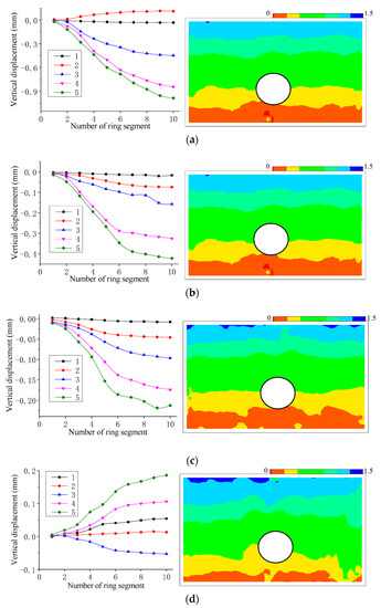 Displacement and contour of measuring point during shield tunneling: (a) Grouting filling coefficient 1.2; (b) Grouting filling coefficient 1.4; (c) Grouting filling coefficient 1.6; (d) Grouting filling coefficient 1.8.