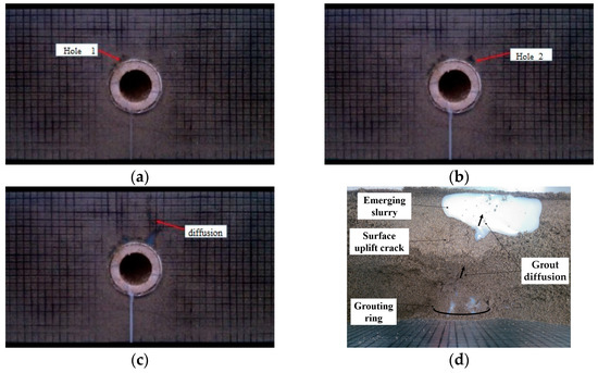 Grout flowing when grouting filling coefficient 2.0: (a) 1 hole; (b) 2 holes; (c) Grout diffusion; (d) Surface diffusion.