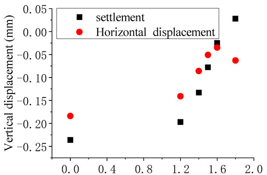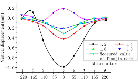 Generally, the subway construction settlement should be controlled within 30 mm. The test settlement value should be controlled within 0.3 mm according to the test similar scale of 1:100. The surface heave displacement with different grouting filling coefficients is shown in Figure 16, where the grouting filling coefficient was 1.4~1.6, and the surface displacement was relatively uniform, meeting the control conditions.