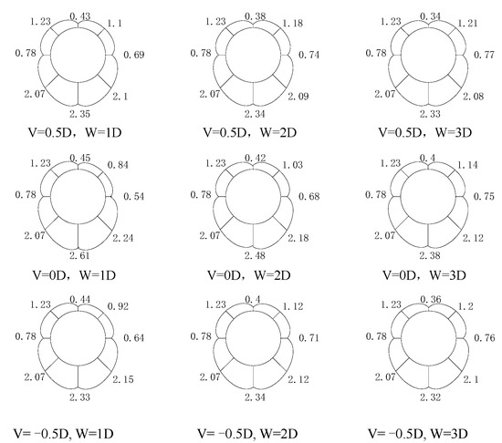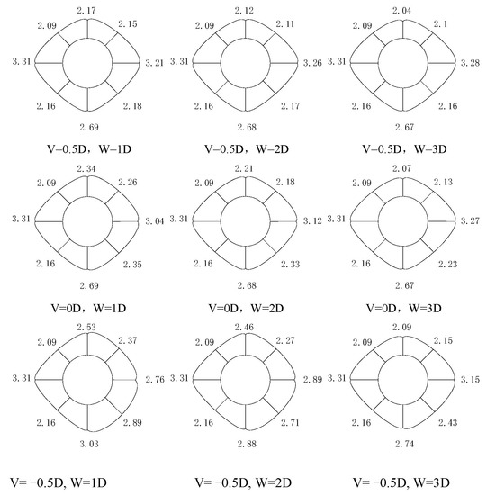 From the above test data, it could be seen that the larger the coverage-span ratio was, the smaller the pile settlement was. The lateral position change in the pile-tunnel had a great impact on the settlement. The 1D→2D settlement decreased greatly, with an average reduction of 52.99%, and the 2D→3D settlement reduced, on average, by 14.31%. When the pile bottom was vertically located at the horizontal line of the arch crown (V = 0.5D), the settlement was the largest. When the pile bottom was below the arch waist, the vertical settlement was controlled to a certain extent. The greater the buried depth of the pile, the smaller the vertical settlement value was.