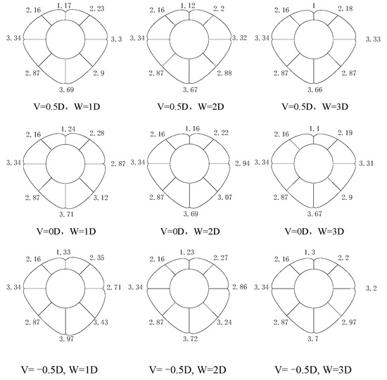 The test results were shown in Figure 12 and Figure 13 when the coverage span ratio of H/D = 2 and 3. Uneven convergence and large deformation damage occurred around the tunnel, and the deformation of the arch crown was the largest, which were 5.08 mm and 4.55 mm, respectively. The test showed that there were two forms of failure: collapse and large deformation, in the unsupported excavation of the silty clay layer; therefore, it cannot be classified as self-stable.