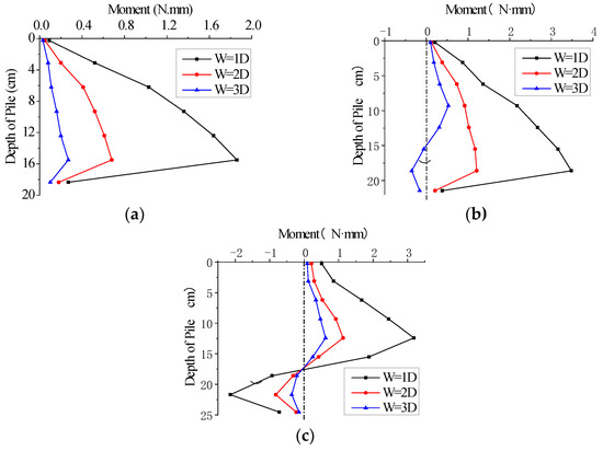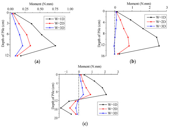 Bending moment of pile at different vertical positions when H/D = 1: (a) V = 0.5D; (b) V = 0D; (c) V = − 0.5D.