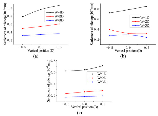 Settlement of pile top: (a) H/D = 1; (b) H/D = 2; (c) H/D = 3.