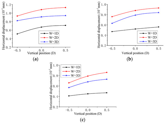 Horizontal displacement of pile top: (a) H/D = 1; (b) H/D = 2; (c) H/D = 3.