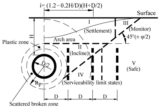 The weak surrounding area around the pile side was divided into five parts: the coordinated movement of surrounding rock and pile in zone I was the most intense, with the largest settlement and horizontal displacement. Safety construction measures such as reinforcement and underpinning piles to prevent over-settlement of buildings and structures in this area should be taken. It is recommended that the short piles in this area should be densely distributed. Zone III will be affected by shielding construction, but generally it would not pose a great threat to the normal use and the safety of buildings and structures. Real-time monitoring should be carried out during construction. If piles were driven in this area, it is recommended to use sparse piles and keep them deeply buried. engineering accidents such as pile over-displacement or inclination are expected. When the shield jacking force acts on the tunnel face, the jacking can easily cause the pile to bend back or forth along the jacking direction, and the pressure change in shield tail grouting can cause the pile to bend left or right perpendicular to the tunnel axis. In the actual shield construction process, isolation and reinforcement measurements should be constructed to prevent the pile from excessive settlement and inclination and prevent the internal force and deformation of the pile from reaching a limited state. The settlement of piles in Zone IV was small, but due to the stress release of surrounding rock near the arched camber line, the piles bear negative bending moments. The uneven stress effect of the piles would pose a threat due to different shield friction and grouting parameters at the same time. The main factors considered in this area were the limit state of the normal use of piles and the according safety issues. This area could be considered the best zone for an isolation pile driving area. Zone V could be considered as the safe area for the pile-shielding system. Shield excavation has little impact on these surrounding layers, which neither cause the large displacement nor the ultimate bending moment of the pile.