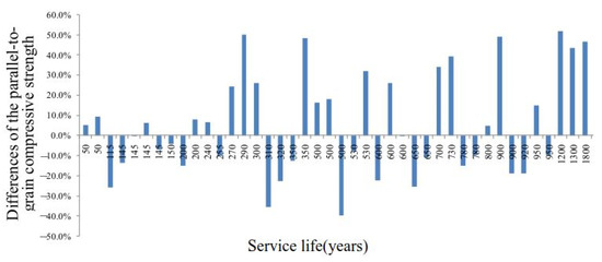 The parallel-to-grain compressive strength of clear specimens obtained between the 1950s and 2020s are summarized in Figure 1, which is drawn based on the data of new and old materials in Appendix A. The Y-axis label in Figure 1 is the percentage difference of parallel-to-grain compressive strength between the aged timber () and new timber (), denoted as . They have been obtained from samples ranging from 50 to 1800 years old (Appendix A).