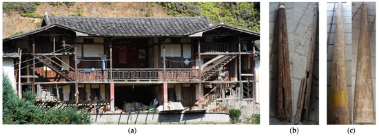 Chinese fir is a popular wood species used for construction in southern China. The properties from five log samples, three aged and two new, are included in this study. The aged samples shown in Figure 3b are from columns in a hundred-year-old building in Yangzhou City, Jiangsu Province, China (t = 100); as shown in Figure 3a, the aged columns come from the exterior of the house. They were taken down in a refurbishment program, due to localized decay or cracking. Decay is caused by fungi that invade and multiply in the wood. Cracks are a detachment of wood fibers caused by external forces or changes in temperature and humidity. As the climate change over the last hundred years is unknown, and the effect of temperature and humidity on building components is cumulative, we have assumed that the rate of decay in wood is uniform and that the extent of decay caused by these factors will increase linearly with time. The new samples (t = 0) shown in Figure 3c are from the timber market in Yangzhou City, Jiangsu Province, China.