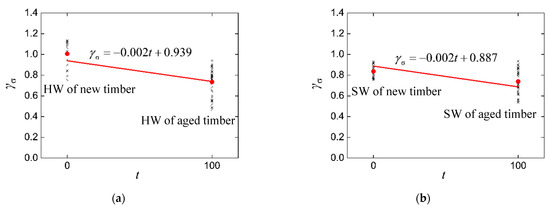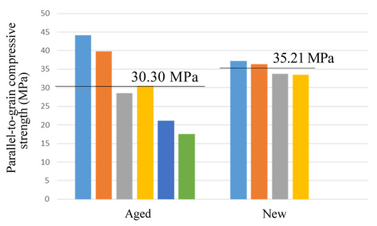 Aged timber has experienced long durations of permanent axial load with residual compressive parallel-to-grain deformation [2,3]. The deformation induced by the axial load was assumed to be uniform across the whole cross-section, and the density of the HW and SW had a difference less than 2.0%. The variation in density along the radial direction of the new CL was noted to be opposite to that of the aged CL, with the density of the HW being 10.70% less than that of SW. The parallel-to-grain compressive strength of the HW in the new CL was approximately 15.09% smaller than that of the SW. However, the parallel-to-grain compressive strength of the aged log segments was less than that of the new log segments, as listed in Table 4, with , , and for the standard specimens listed in Table 3. This is due to the higher density of the SW compared with that of the HW, in new CL [33]. The aged and new logs in Table 4 are from a limited number of samples with natural defects according to their age, and the standard deviations of aged and new CL are 9.40 and 1.58, respectively. Significant differences of dispersion between the aged and new CL can be noted from Figure 5.