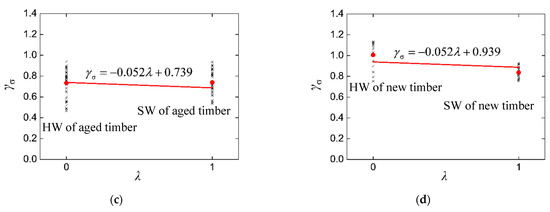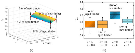 where is the parallel-to-grain compressive strength of segments of the log sample. The calculated γσ is separated into four groups, according to age of samples (t = 0 for the new CL and t = 100 years for the aged CL) and sampling position (λ = 0 for HW and λ = 1.0 for SW) of the standard specimens. The 3D plot and boxplot of γσ are shown in Figure 6. In the boxplot, symbols ‘•’ and ‘×’ outside the box represent the maxima and minima, respectively; the symbol ‘▫’ within the box represents the sample mean of the data; the upper and lower edges of the box represent the upper and lower quartiles of the data, respectively; the solid line within the box represents the median. Our results show that the distributions of γσ of the HW and SW in the aged CL are similar. The maxima and range of data of the HW in the new CL are significantly higher than those of the other three groups, which is shown in Figure 6b. The distribution of γσ of the SW in the new CL is relatively centralized.