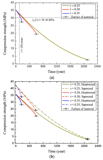 where is the compressive strength at time, t; is the initial compressive strength of timber; is the time-dependent model of the design strength, including the load duration effect and stress level, , defined as the ratio of actual stress to compressive strength; is the time-dependent function of the geometric parameter of component sections with decay [4]; and is the time-dependent function of the thickness of the decay layer of timber, as shown in Equation (13).