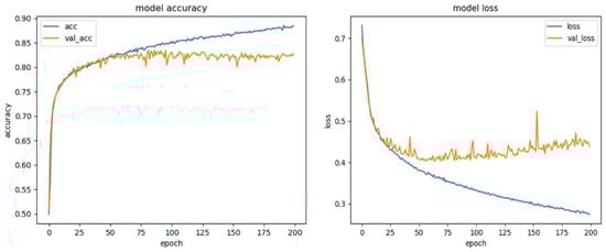 In the model accuracy distribution, acc denotes the correct rate of the training set and val_acc stands for the correct rate of the testing set. After 200 training runs, the highest correct rate in the experimental result achieves 82.75%.
