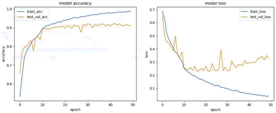 In the model accuracy distribution map, train_acc denotes the correct rate of the training set and test_val_acc is the correct rate of the test set. After 50 training runs, the highest correct rate in the experimental result is 91.2%.