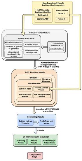 First, in the proposed methodology, a “base experiment” is defined considering a relevant case of use of ad hoc IoST networking. Then, orbits of potential nodes participating in the network are generated considering actual satellite orbits. With this information, a Monte Carlo simulation of the ad hoc IoST network was performed using our ST-INETMANET simulation testbed developed explicitly for this purpose. The resulting network performance metrics were then formatted to apply the 2k factorial analysis [61].
