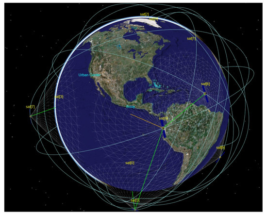 The space network mission for the base experiment considers the potential offered by ad hoc IoST networking to provide connectivity for underserved areas during natural or artificial disasters [62]. The base experiment assumes that a remotely located node sends information to an urban center through an ad hoc IoST network. The remote node is located in the Pacific (e.g., buoy) at coordinates (9°35′42.0″ N, 95°08′37.2″ W) for the implementation. The sink is located (31°52′07.7″ N, 116°39′59.1″ W) in an urban center. This scenario arises in early warning systems where an open ocean buoy transmits relevant weather and tide information to a coastal urban center. Depending on the deployment location, the ad hoc IoST network could serve as a primary or backup communication mechanism.
