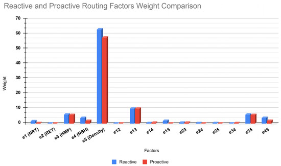 The NRT and HMP (e13) combination shows the second weight overall; thus, this is the most relevant combination. NRT defines the time a node is stored in the neighbors table. The freshness of routing information depends on NRT and HMP; thus, its combination captures the dynamic of the network topology in terms of the links currently available. Note that the third-highest weight in Figure 3 belongs to HMP; hence, it is the second most relevant individual factor. Considering this, and the NRT and HMP combination weight, it can be stated that the dynamic of the network topology in ad hoc IoST networking must be properly addressed when designing routing protocols for this kind of network. The density and HMP combination are relevant as well (fourth weight in Figure 3), which further reinforces our previous statement.