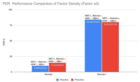 Results are presented in Figure 4 for low and high density values. The results show that density plays a significant role in the network’s performance. The change from low to high density increases the PDR from 9.8% and 14.6% to 84% and 80% for the reactive and proactive approaches, respectively.