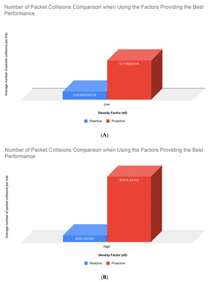 Comparison of the average number of collisions in the best scenario from the factors results of a proactive and reactive routing approach in IoST with the density factor (e5). (A) Low node density; (B) high node density.