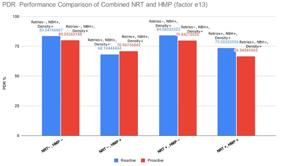 In this subsection, we further analyze the impact of the two most relevant factors identified in the 2k factorial analysis: Density and the NRT–HMP combination. Our goal is to identify which factor values provide the best routing performance in terms of the PDR.
