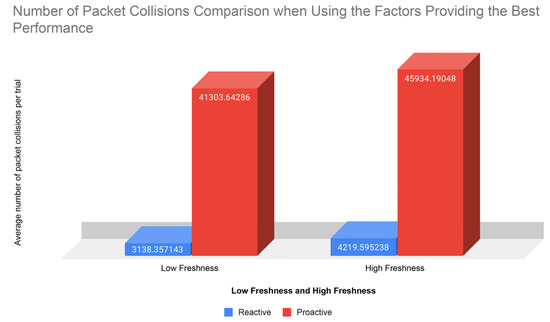 Note that the reactive algorithm outperforms the proactive approach in ad hoc IoST scenarios with high node density. Conversely, the proactive algorithm performs better in low node density scenarios. This change can be explained considering that a short HMP (low value) and short NRT (low value) increase the control information for the proactive approach. Thus, the number of packet collisions in an ad hoc IoST network with high node density should be considerably higher for proactive routing than reactive routing. This is confirmed by the results presented in Figure 5, which compare the average number of packet collisions per trial obtained using the proactive and reactive approaches analyzed in this work. Note that the results presented in Figure 5 were obtained using the factors that provide the best performance for each routing strategy. These results confirm that the average number of packet collisions in an ad hoc IoST network with high node density is significantly higher for the proactive approach than the reactive approach. Thus, this explains why, for an ad hoc IoST network with high node density, a higher PDR was achieved when using the reactive routing approach (see Figure 4).