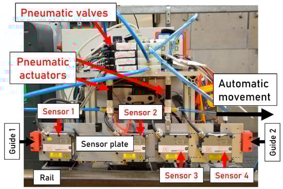 The identical experimental setup was used as the one described by Mauz et al. [10] and consisted of a reference rail of length tactilely measured by METAS (Swiss Federal Institute of Metrology) on two parallel longitudinal lines. The setup is shown in Figure 1. For the optical measurement, four Micro-Epsilon optoNCDT 2300-10LL laser triangulation sensors are mounted on a sensor plate. The sensor plate is connected to the slider via pneumatic actuators. The pneumatic actuators allow a defined vertical movement to be applied to the sensor plate. Guides restrict major lateral deflection during longitudinal movements of the slider. The arrangement is automatically moved along the rail by a linear drive with a velocity of . The sampling distance of the measurements is adjusted to the METAS reference measurement via resampling. This results in a data point distance of . The four sensors record analog data in a range from to , with a sampling rate of . Analog signals from the sensors are recorded with an NI 9222 module within a cRIO-9045 from National Instruments using LabView. In addition, an encoder signal of a Leine Linde RSI 593 is recorded using an NI 9402 module to determine the position along the rail. The measurements are not triggered via the encoder.