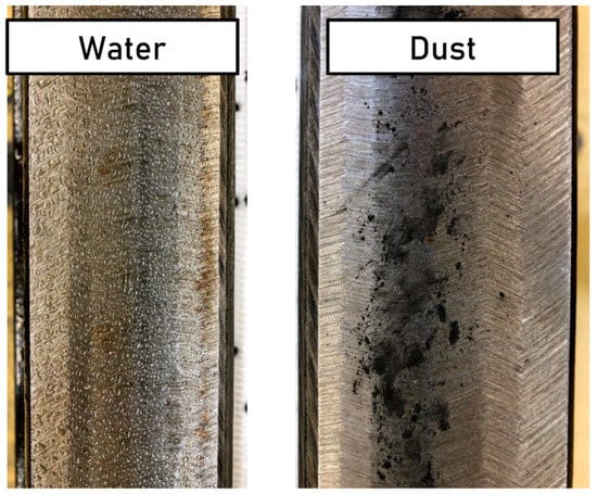 - Water: Wet track conditions occur in operation, for example during rainfall. Water or moisture on the rail will be rolled over, and will have no influence on the acoustic emission from the wheel-rail contact. Nevertheless, water can affect the optical measurement method, and must be considered in this study. Water is sprayed onto the surface of the rails. A uniform distribution is targeted, which is shown in Figure 2.