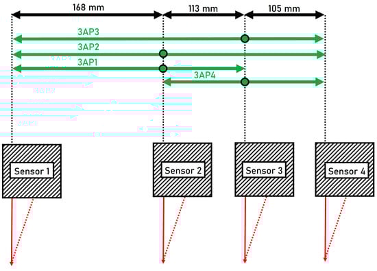 If a method selection would be made for this wavelength range, the method 3AP1 with the smallest deviation from the amplification factor one would be selected. The sensor distances given in Table 1 are the result of a numerical optimization based on the stated quality criterion . The distances between two adjacent sensors should be between and , and the length of the total arrangement should not exceed . Each possible configuration is evaluated in step sizes with a quality factor for each sensor configuration. First, all are calculated and summarized in a matrix :