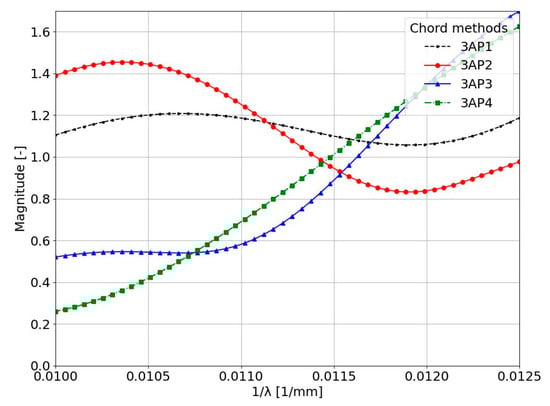 For each one-third octave band, it is possible to choose the optimal chord method with an amplification factor as close to one as possible. The selection of the appropriate chord method for the respective one-third octave band was performed based on the following quality criterion: