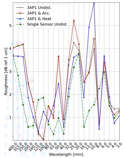 is the level in decibels, is the value of roughness in micrometers and is the reference value of roughness with a value of . The peripheral areas (representing the ends of the rail) of the signal were removed to avoid interference with the chord method. A pre-filter is applied for the wavelength range from to . For the acoustic roughness, the averaged relative error in percent and the averaged absolute error are calculated for the spectrum from to . The absolute error was calculated as the difference between the reference and the respective measurement per one-third octave band. The averaged absolute error thus corresponds to the averaging of the deviation over all one-third octave bands of a spectrum.